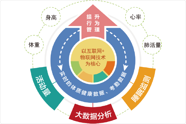 用互联网+物联网技术,通过数据采集设备,实时的探测、收集、分析学生的活动体质健康数据