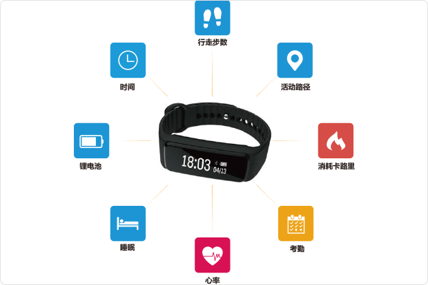 具有NFC日期时间显示、行走步数、消耗卡路里、校园活动路径、心率监测、考勤统计、睡眠质量侦测。无线传输手环中的侦测数据,接收短消息通知功能
